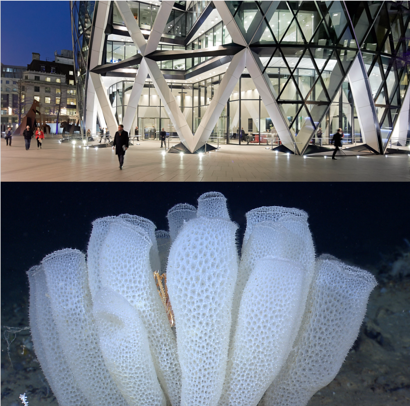 The Gherkin is a skyscraper in London, built by Norman Foster. The biomimicry can be observed in its structure, which is inspired by the Venus Flower Basket marine sponge, a kind of glass sponge. It’s able to survive at great depths, supporting the crushing weight of the water. Its exoskeleton provides stiffness and the ability to bend at the intersecting points of the mesh, and its round shape helps disperse the forces from strong currents.